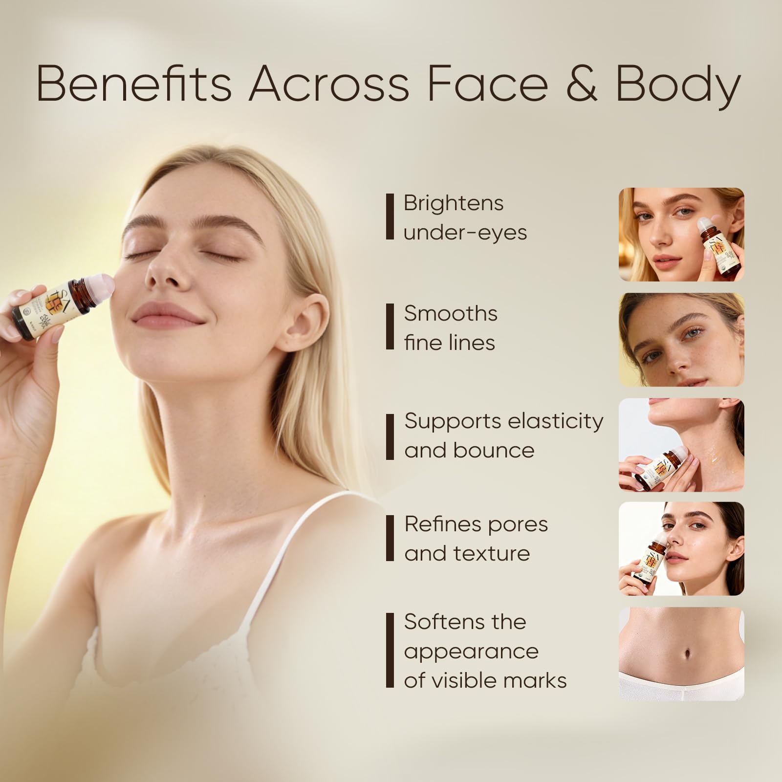 【Face, Under-Eye & Full-Body Use】 Suitable for facial skin, under-eye area, neck, shoulders, joints, and dry body areas — one versatile roll-on for everyday care.